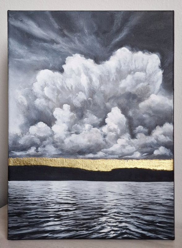 Kuvaus: Akryylimaaleilla canvakselle maalattu teos, yksityiskohtana 22 karaatin lehtikultaa