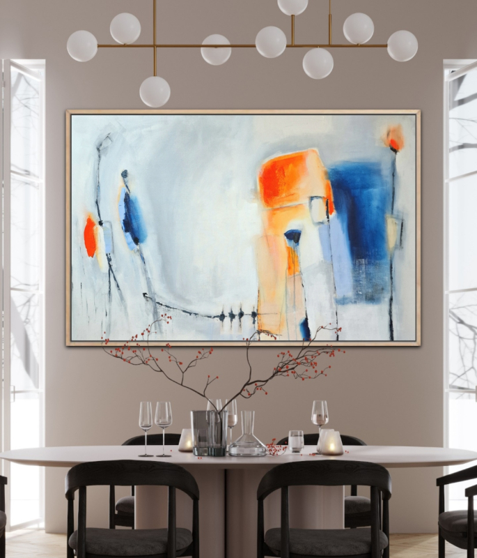 Kuvaus: Akryyli/sekatekniikka karhealle pellavakankaalle, ripustus valmis