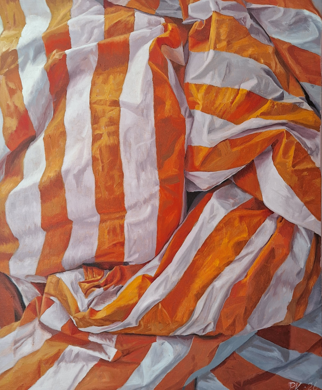 Kuvaus: Herkullinen ja värikäs työ, joka elää valosta lakanoiden moninaisilla laskoksilla.