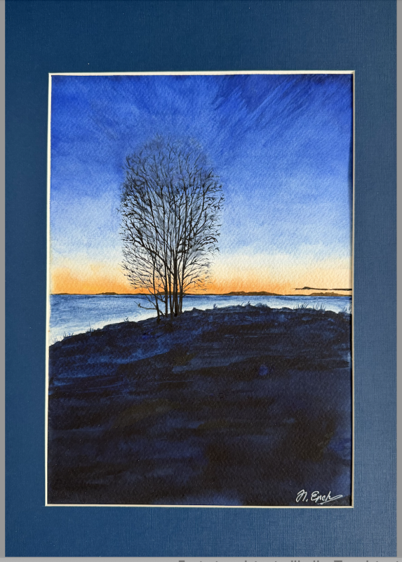 Kuvaus: Passepartout 29,5 x 42 cm, kartonkia, piirustuksen koot 30 x 21 cm. Paperi Fabriano, cold press, 25 % cotton, 300 g/m2. Teos nojaa vahvaan pelkistykseen: tumma ranta, paljas puu, kylmä vesi ja matala lämmin horisontti. Syvänsininen etuala ja taivas kehystävät ohuen valovyöhykkeen, joka pitää kuvan jännitteisenä. Tunnelma on hiljainen ja kirkas, melkein pidätelty — kuin päivä olisi juuri vetäytymässä näkyvistä.