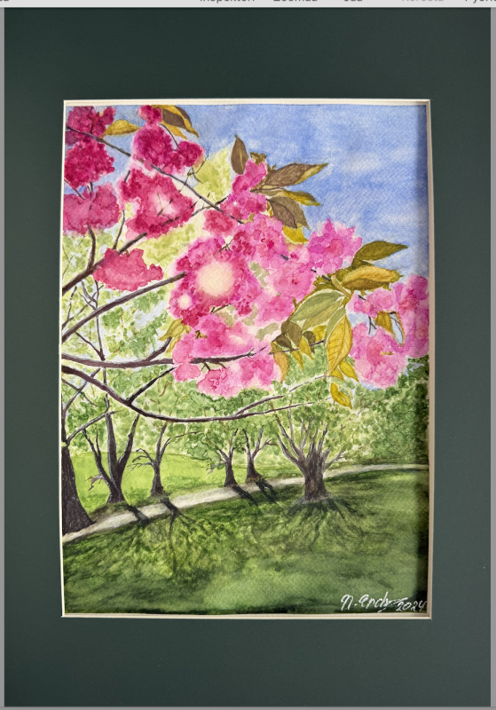 Kuvaus: Passepartout 29,5 x 42 cm, kartonkia, piirustuksen koot 30 x 21 cm. Paperi Monet, 100 % cotton, 300 g/m2. Teos rakentuu kukkivan oksiston ja avautuvan puistomaiseman varaan. Etualan runsas vaaleanpunainen kukinta kehystää näkymää ja tuo kuvaan läheisyyttä, kun taas vihreä nurmi ja pitkät varjot avaavat siihen tilaa ja valoa. Tunnelma on keväinen, kirkas ja elävä ilman liiallista pehmeyttä.
