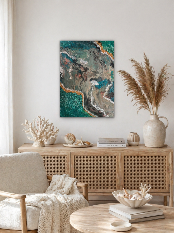 Kuvaus: Abstrakti maalaus, joka on saanut inspiraationsa merestä. Lazuurin ja turkoosin sävyt luovat vaikutelman veden liikkeestä, syvyydestä ja rauhasta. Virtaavat muodot ja koristeelliset elementit muistuttavat meren rantaa, jossa aallot kohtaavat kivet ja hiekan. Epoksihartsi tuo pintaan kauniin kiillon ja elävän vaikutelman, joka muuttuu valon mukaan. Teos tuo tilaan raikkautta, keveyttä ja luonnonläheistä tunnelmaa. Tiedot: Koko: 50 × 70 cm Paksuus: 1,5 cm Paino: 1,880 g Tekniikka: Fluid Art Materiaalit: akryyli, epoksihartsi, koristekristallit