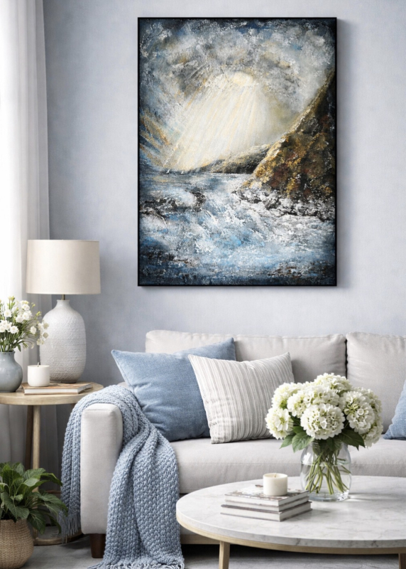 Kuvaus: Abstrakti maalaus, joka kuvaa merta myrskyn jälkeen. Siniset ja vaaleat sävyt luovat rauhallisen ja raikkaan tunnelman. Teoksessa näkyy veden liike ja hiljentyminen. Se tuo tilaan rauhaa ja luonnon tuntua. ⸻ Tiedot: Koko: 50 × 70 cm Paksuus: 1,5 cm Paino: 1,2 kg