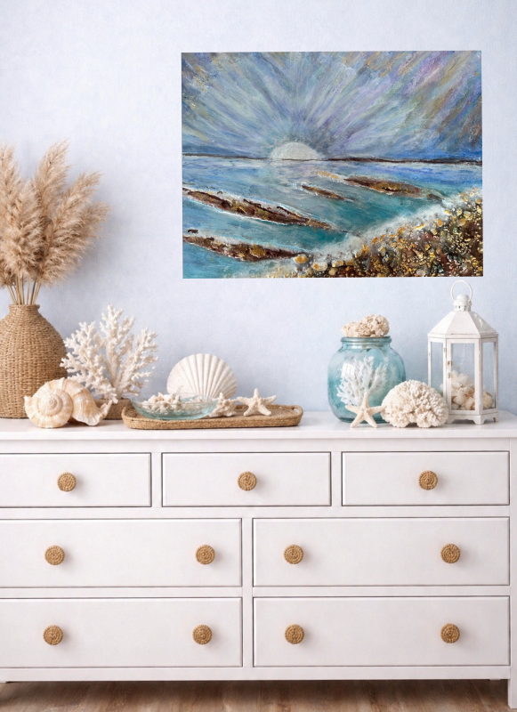 Kuvaus: Abstrakti maalaus, joka kuvaa merta aamun valossa. Vaaleat siniset sävyt ja nouseva valo luovat rauhallisen ja harmonisen tunnelman. Teoksessa näkyy veden liike, ranta ja horisontti. Pinta elää valon mukaan ja tuo tilaan raikkautta, valoa ja luonnon tuntua. ⸻ Tiedot: Koko: 50 × 40 cm Paksuus: 1,5 cm Paino: 0,79 kg Tekniikka: sekatekniikka (akryyli) Materiaalit: akryyli, epoksilakka, pigmentit, keinotekoiset ja luonnonkivet