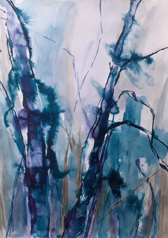 Kuvaus: Yksinäinen puu seisoi joutomaan reunalla, ja sen sinnikkyys jäi mieleeni. Halusin ikuistaa sen muistutuksena siitä sitkeästä elinvoimasta, jota jokainen elävä olento tarvitsee. Joutomaat ja rotkot terävöittävät aisteja tavalla, johon kauniit maisemat eivät koskaan pysty. Maalasin lempivärini turkoosin vauhdikkaasti ja intuitiivisesti. Tämä taideteos tuo tunnelmaa ja läsnäoloa mihin tahansa tilaan. Sen lumoava turkoosi välittää katsojalle voiman ja rauhan tunteen kaikissa elämänvaiheissa. Muste ja akvarelli 300g paperille.