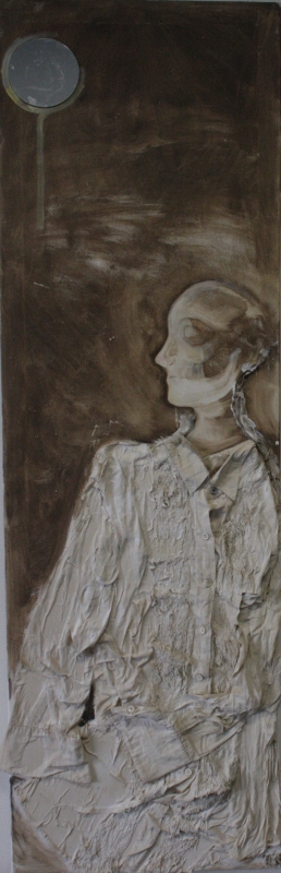 Kuvaus: Tekstiireliefin lisäksi maalauksessa on peili, jonka kiinnipysyvyyttä ei voi pitkällä aikavälillä ennustaa. Huomioitu hinnassa.