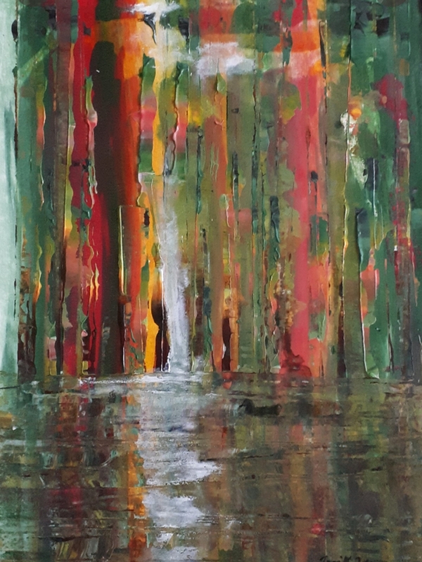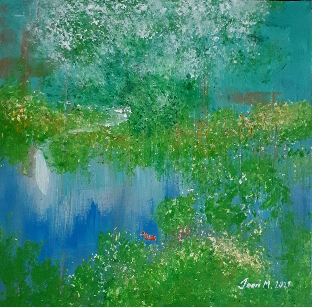 Katson taivasta ja puiden latvoja ja haltioidun, on kuin tulisin kotiini. Nämä tunnelmat siirtyvät kankaalle, maalaan sydämeni värit.