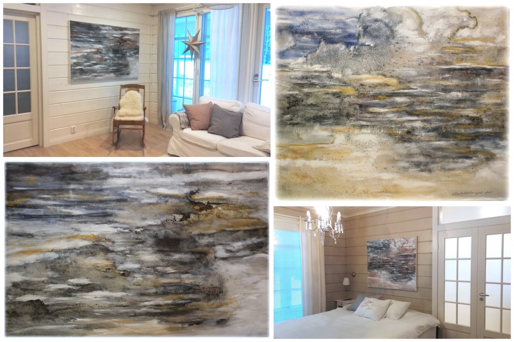 Tämä maalausten sarja pääsi upeaan miljööseen juuri sille sopivalle paikalle. Olen tehnyt tämän tilaustyönä. Maalausten koko on 2x90*90 ja 1x60*90.