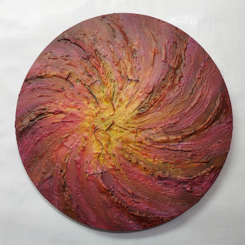 Kuvaus: Punasävyinen pyörremyrsky runsaalla tekstuurilla kanvaasille