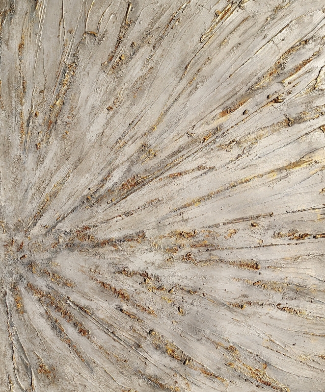 Kuvaus: Vaalea abstraktiteos tehostettu kultamaalilla, voimakas struktuuri