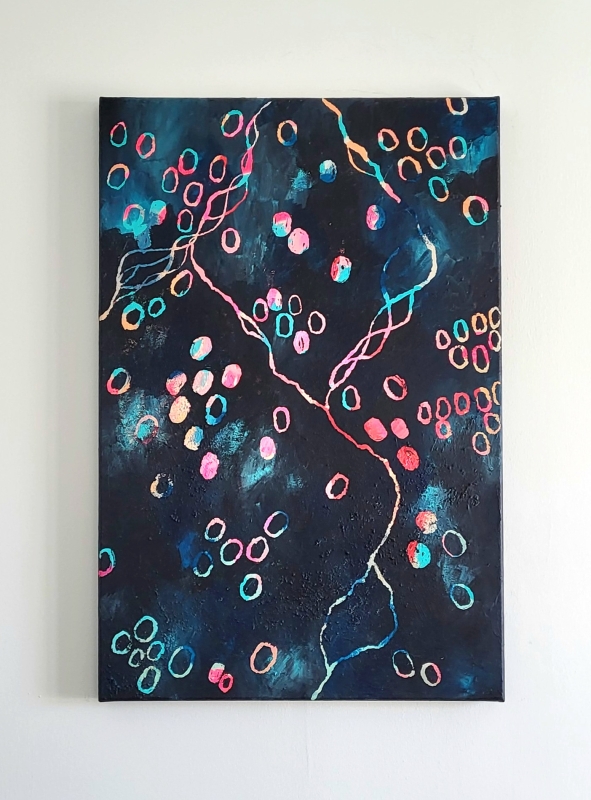 Kuvaus: Abstrakti teos kanvaspohjalle. Akryylimaalia ja tekstuuripastaa. Reunat maalattu mustaksi, ripustusvalmis. Nouto Oulusta tai lähetuskulut 30€.