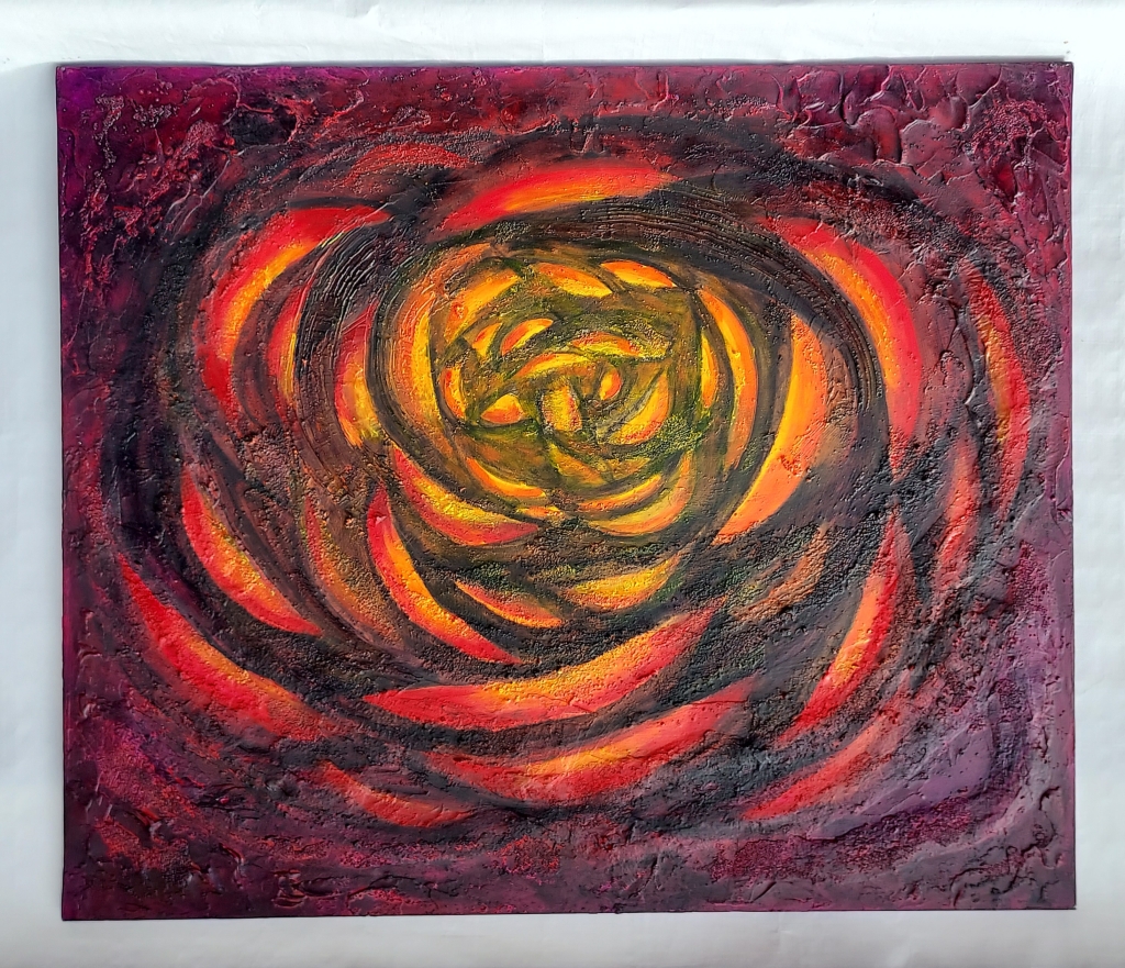Kuvaus: Rouhealla tekstuurilla ja voimakkailla väreillä maalattu teos