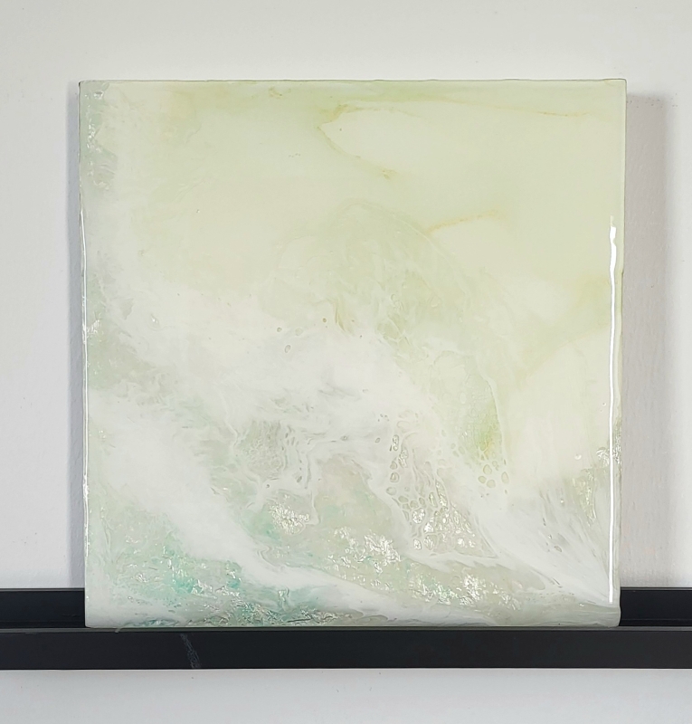 Kuvaus: Sekatekniikkateos puupohjalla. Päällä kiiltävä epoksipinta aaltoefektein. Reunat maalattu valkoisiksi. Ripustusvalmis, ja voi laittaa miten päin vain. Nouto Oulusta tai lähetyskulut 10€. Teos on tällä hetkellä esillä Haukiputaan Takomotien Corella.