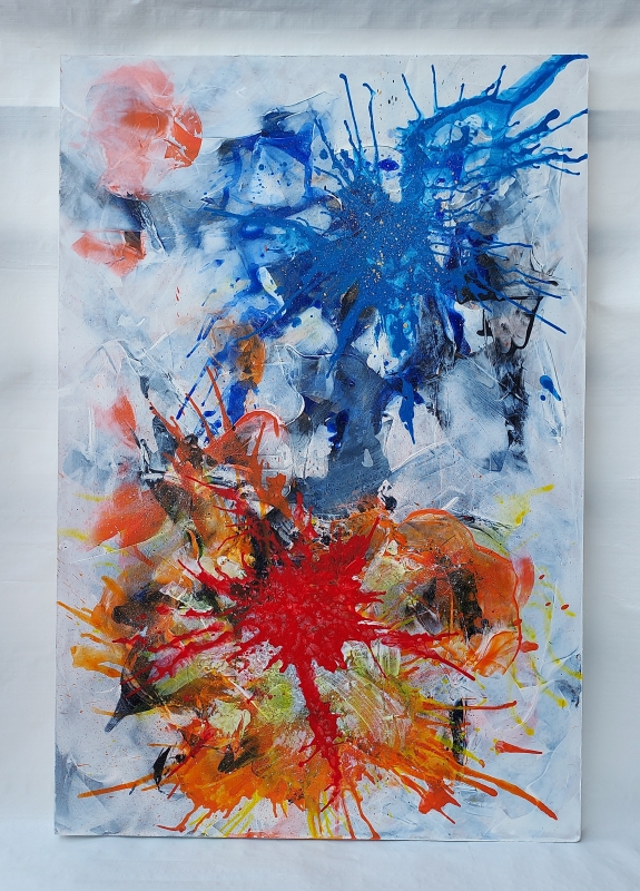 Kuvaus: Vaalealla pohjalla runsas värityksellinen abstraktiteos