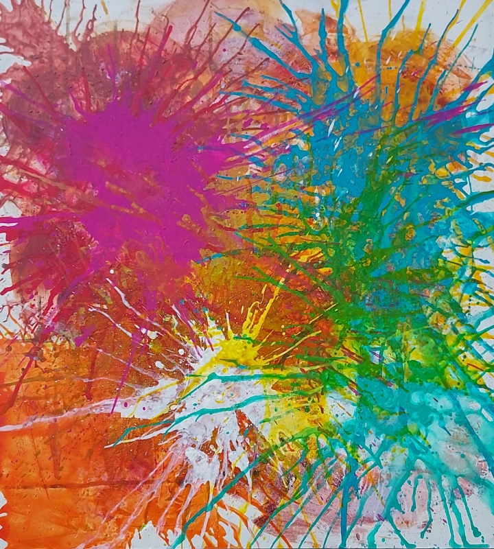 Kuvaus: Pirteän värinen "roiskahteleva" abstraktiteos