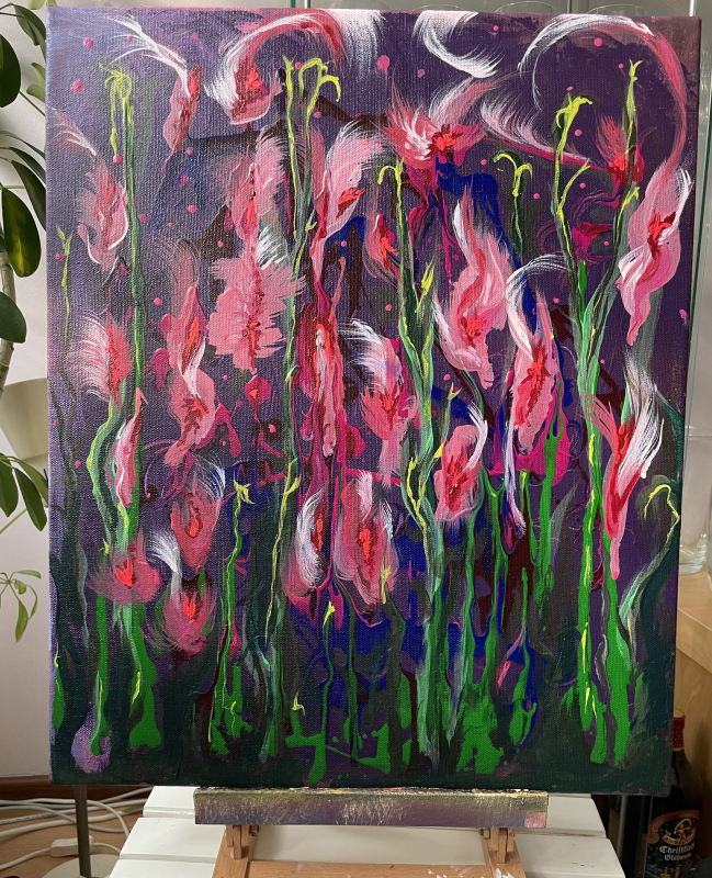 Kuvaus: Teos ihana väriyhdistelmä syvää lilaa, pinkkiä ja vihreää