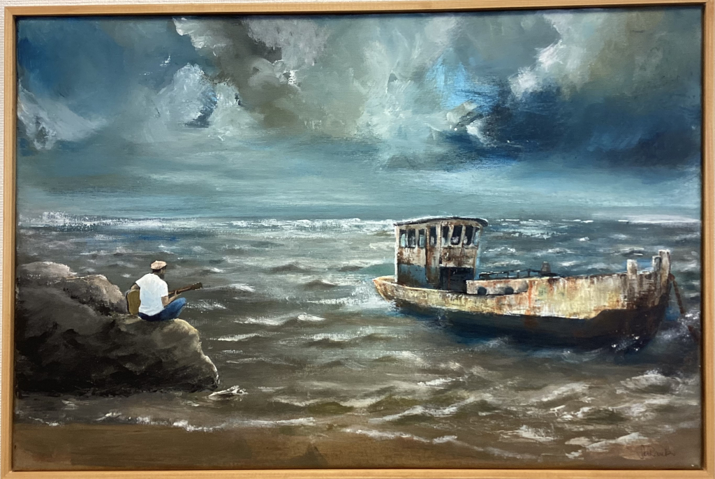 Kuvaus: Teos 3.10.asti näyttelyssäni (Galleria Palkki) Näyttelykehys (tammen värinen puulista) paikallaan.