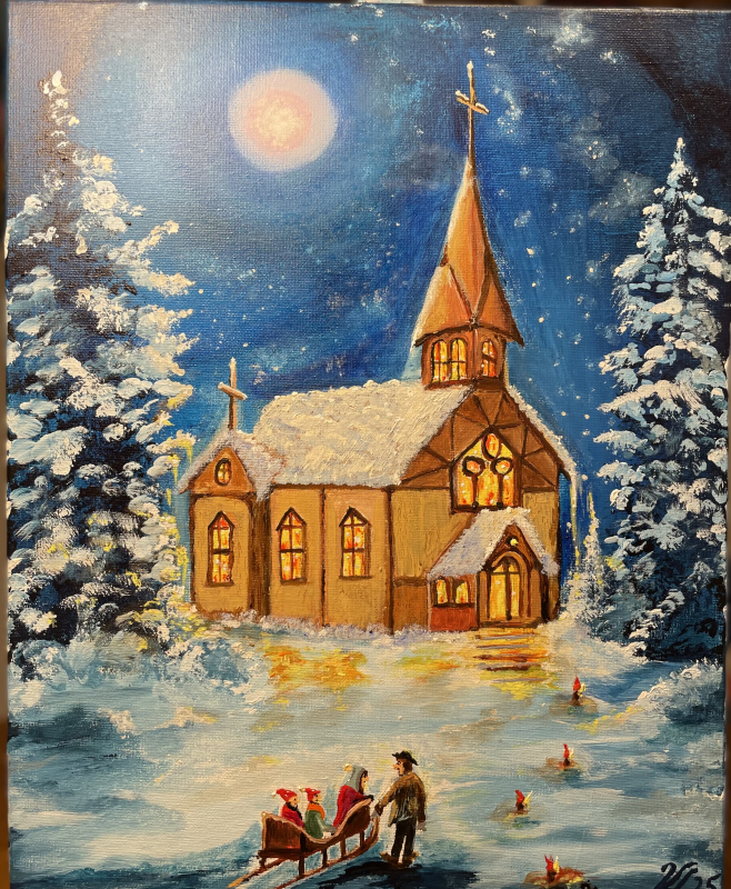 Kuvaus: Nostalginen aattoilta, perhe reellä matkalla vanhaan puukirkkoon. Pihalla tuikkivat kynttilät, vai onko ne tonttuja?