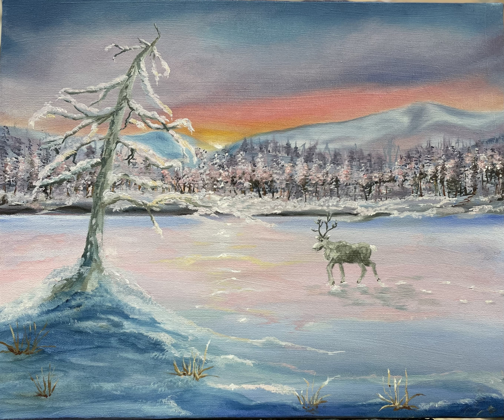 Kuvaus: Ennen kaamosta. Viimeinen valo laskee tuntureiden taakse. Myös poro ihmettelee kaikkea kauneutta lapin perukoilla