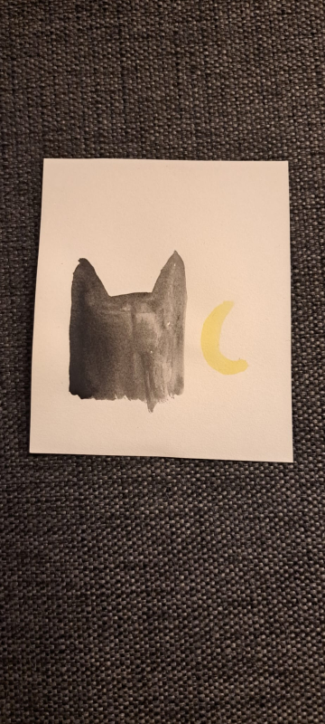 Kuvaus: A black cat or the batman staring sadly a banana