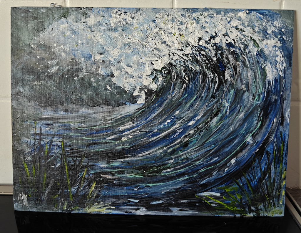 Kuvaus: Aaltoaiheinen maalaus, jossa liike ja energia kohtaavat rauhallisen tunnelman. Syvät sävyt ja pehmeät muodot tuovat esiin meren voiman ja kauneuden. Teos luo tilaan dynaamista mutta tasapainoista ilmettä.
