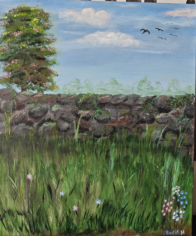 Kuvaus: Tunnelmallinen maalaus, jossa vanha kivimuuri ja yksinäinen puu kohtaavat. Teoksessa korostuu rauha, hiljaisuus ja ajan pysähtynyt tunne. Pehmeät sävyt ja varjot luovat syvyyttä, ja puu tuo mukaan elämän ja toivon elementin. Kokonaisuus on pelkistetty mutta ilmeikäs.