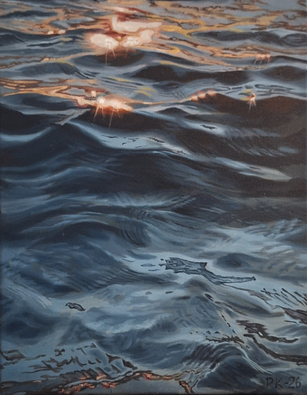 Kuvaus: Veden rytmi ja rytmittömyys vangitsevat tämän työn äärelle. Illan viimeiset säteet heijastuvat veden pinnasta kullaten viimeiset hetket ennen hämärää.