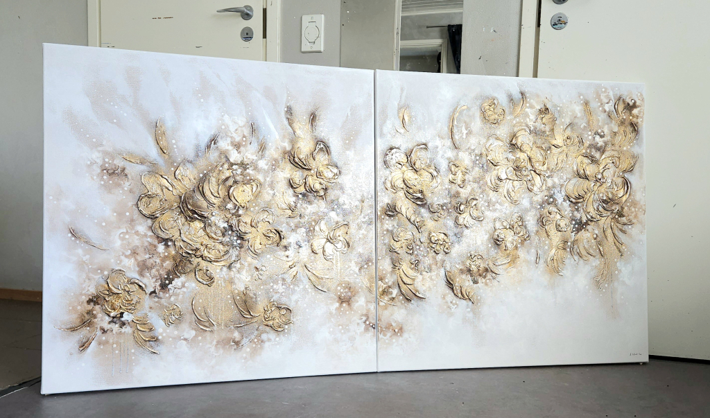 Kuvaus: Kohopintainen akryylimaalaus. Kullan ja helmiäisen hohtoa