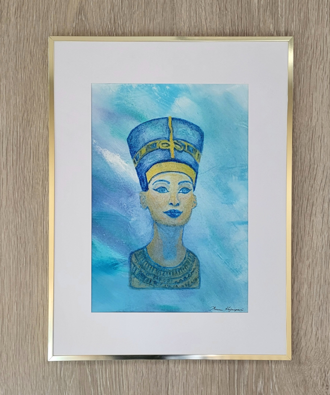 Kuvaus: Sekatekniikkateos Nefertitistä. Kehystetty 30x40 kokoiseen kultareunaiseen kehykseen. Nouto Oulusta tai lähetyskulut 10€.