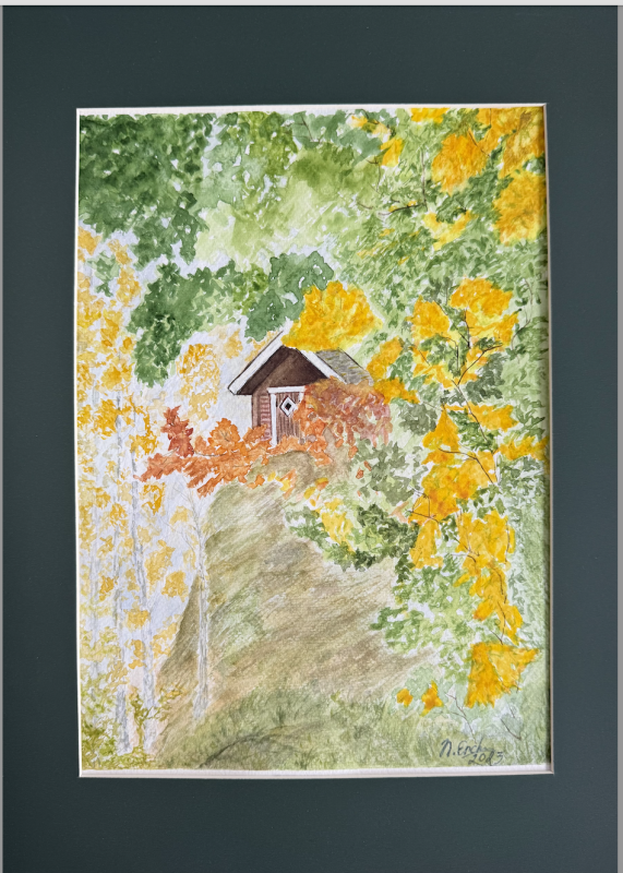 Kuvaus: Paperi Fabriano, cold press, 25 % cotton, 300 g/m2. Teos rakentuu lehvästön ja kätkeytyvän rakennuksen väliselle suhteelle. Keltainen ja vihreä lehvästö täyttää pinnan valolla, kun taas pieni maja jää lähes suojaisaksi keskukseksi kaiken keskelle. Kokonaisuudessa on varhaisen syksyn kirkkautta ja tunne paikasta, joka löytyy vasta kun katsoo hetken tarkemmin.