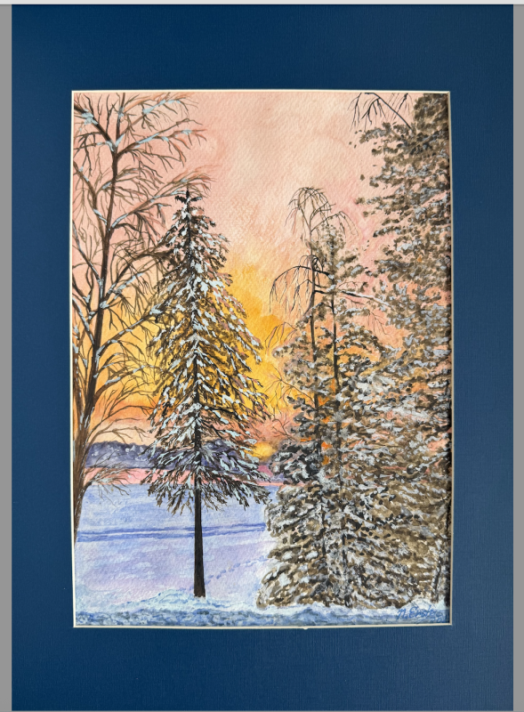 Kuvaus: Passepartout 29,5 x 42 cm, kartonkia, piirustuksen koot 30 x 21 cm. Paperi Fabriano, cold press, 25 % cotton, 300 g/m2. Teoksessa talvimaisema avautuu puiden lomasta kohti matalaa, hehkuvaa valoa. Lumiset oksat ja viileä sininen maa kehystävät taivaan lämpimät sävyt, jolloin kuvaan syntyy hieno jännite kylmän ja lämmön välille. Tunnelma on hiljainen ja kirkas, kuin hetki juuri ennen yön tuloa.