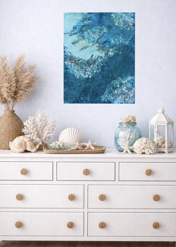 Kuvaus: Abstrakti Fluid Art -maalaus, jossa siniset sävyt, kivet ja epoksihartsi luovat veden liikkeen ja syvyyden vaikutelman.