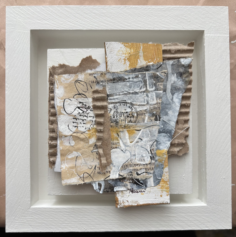 Kuvaus: MixedMedia työ, puukehyksissä. Kierrätysmateriaalista, sekä itsemaalatuista osista tehty.